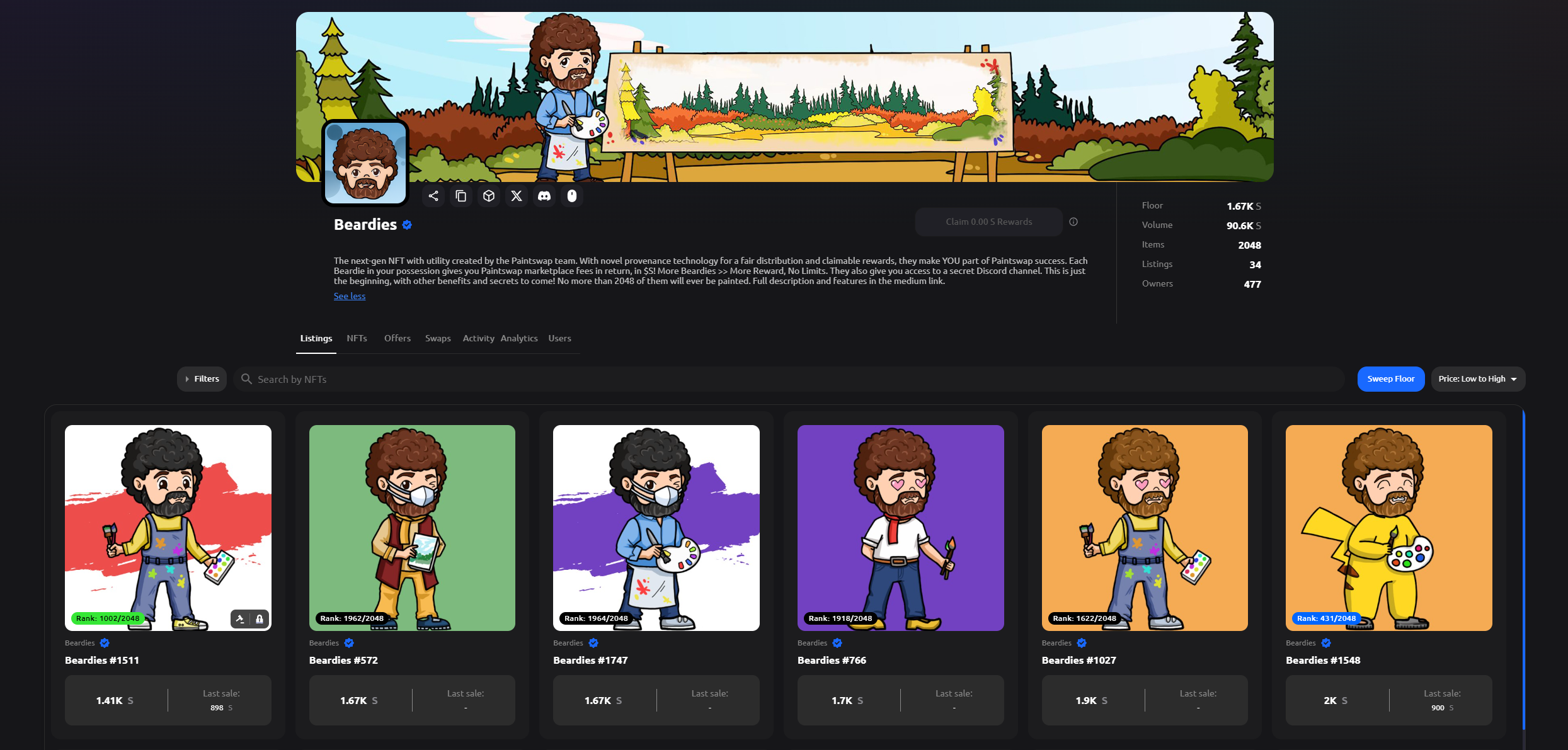 Sonic NFT 交易市场 Paintswap 的官方 NFT 项目,总量 2048 个,目前地板价是 1670 $S,大约是 950 美元。