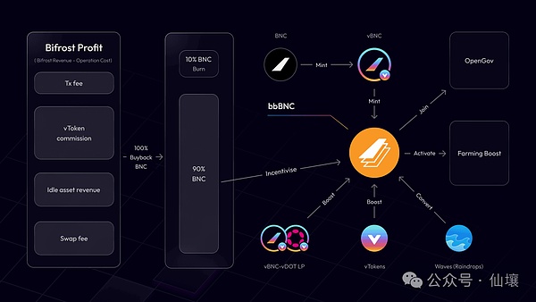 目前的 Bifrost,所有的协议收入直接进入到国库,直接在业务端发力来拓展业务,但并没有和 BNC 代币持有人有利益共享。Bifrost 2.0 版本的经济模型计划将协议利润的100%用于BNC回购,90%分配给 bbBNC 持有者,剩余 10% 将被销毁。