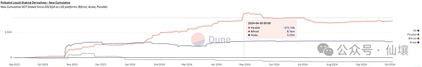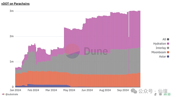 通过上图我们可以发现,目前 Bifrost 的主要 staking 业务是 DOT。尤其是在 2023 年底波卡迎来第一批卡槽拍卖的 DOT 解锁,Bifrost 凭借自己出色的服务和较低的费用,以及 SLP+SLPx+vToken 的技术支撑,一跃成为了波卡LST协议中的第一,占据了 DOT LST 60% 以上的市场。