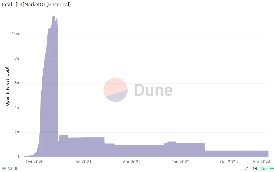 加密预测市场的先驱是 Augur,它允许第三方对事件结果进行投注。Augur 成立于 2015 年,并在同年进行了 ICO($REP),成为最早进行 ICO 的协议之一。经过三年的研究,Augur 于 2018 年在主网上线。Augur v2 于 2020 年推出,但链上活动并未显著增加。其巅峰时期,v2 的未平仓合约仅勉强突破 1100 万美元,而截至今天,仅为 50 万美元。