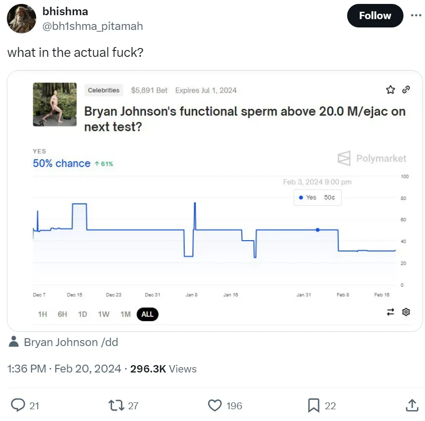 像 Bryan Johnson 这样的奇特市场虽然很有趣,但存在暴露于有害流量和内幕交易的风险。相关人(或其亲友)可能在结算前知道结果,并利用这一点进行财务上的优势。因此,这些市场可能主要用于营销目的,而非实际的财务收益。