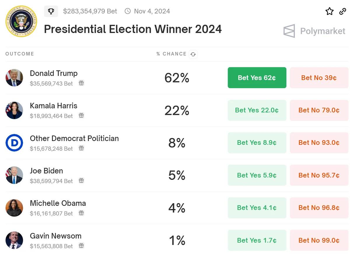 截至今天(2024 年 7 月),Polymarket 已发展成为世界上最大的预测市场之一,仅在拜登和特朗普之间的总统选举中就有超过 2.83 亿美元的未平仓合约。这远远超过了其他所有投注平台,包括中心化竞争对手 betfair(未平仓合约为 3100 万英镑)。