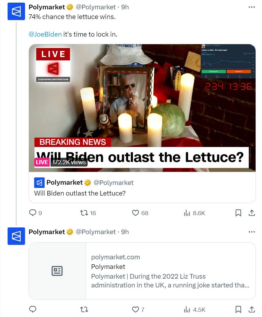 Polymarket 的推特营销策略在竞争对手中脱颖而出。通过色彩鲜艳的模因和机智的俏皮话,Polymarket 获得了更多的关注和互动。与普通的竞争对手推文相比,Polymarket 的推文更具吸引力。
