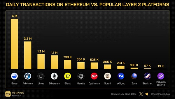 据 Coin98 统计数据显示,Base 除了 TVL 的狂飙突进、仅次于 Arbitrum 之外,每日交易数量更是超越 Arbitrum,堪称一骑绝尘——截至 7 月 22 日的数据,Base 每日交易数量创下历史新高,达到 400 多万笔,几乎是第二名 Arbitrum 的近 2 倍!
