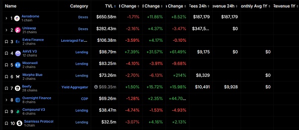根据 DefiLlama 数据,当前 Base 上 DeFi TVL 为 17.4 亿美元,其中几款(半)原生 DeFi 项目的 TVL 占据主导地位,包括 Aerodrome(6.5 亿美元)、Extra Finance(1.06 亿美元)、Moonwell(8325 万美元)、Morpho Blue(7326 万美元)等。