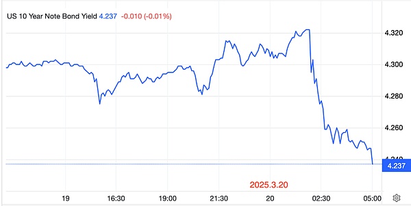 效果立竿见影。美债收益率应声下跌,击穿4.3关口,从4.32一路回落至4.23附近。