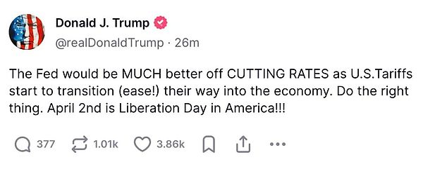另一边,总统则继续发帖鼓励:美联储最好降低利率!