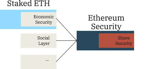 下图尝试描述了其间的关系,质押的ETH,部分成为了经济安全。经济安全和其他的安全因素共同构成了以太坊安全,以太坊安全又部分作为共享安全服务被AVS使用。