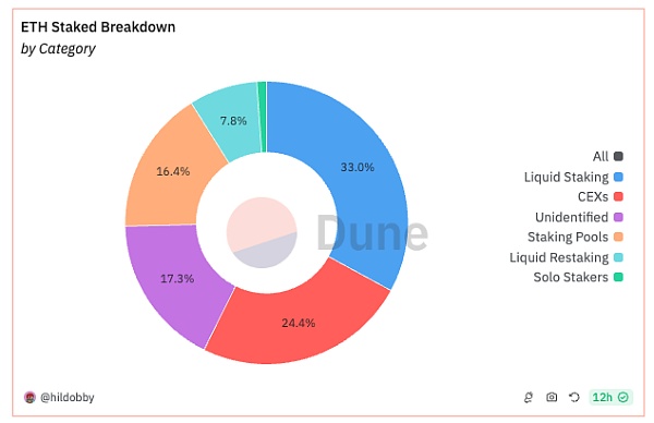 那我们来看一下流动性质押协议和中心化质押服务商的质押现状。目前Liquid Staking占接近33%的质押比例,CEX等中心化服务商占24.4%,相当接近33%这个阈值。