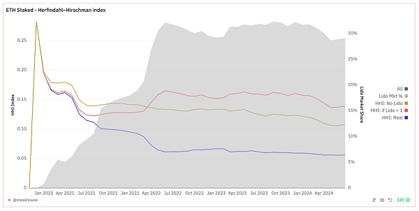 相比CEX,流动性质押好在其通过不同的方式缓解中心化,包括对于服务商选取的DAO治理、双重代币治理、Lido的DVT和Rocket pool的Mini pool。Steakhouse绘制的HHI指数用于衡量以太坊质押的中心化程度(某种意义上,代表了质押金额向经济安全的转化效率),其中HHI Lido Real意味着Lido进行了去中心化治理,HHI Lido Single意味着Lido没有进行去中心化治理,HHI No Lido意味着Lido不存在。我们可以看到,Lido在积极进行治理的情况下(蓝线)对于质押的中心化程度是有促进作用的。