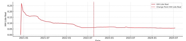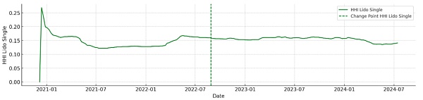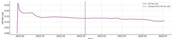 我们进一步对HHI指数的变化进行分析。大概在ETH占总量比例除此达到11%时,也就是2022年八月左右,此时供应量为120m,HHI计算的去中心化增长边际效用开始明显减弱。我们认为此时发生了“质押饱和”的情况——即新增的质押量带来的去中心化改进明显减弱。