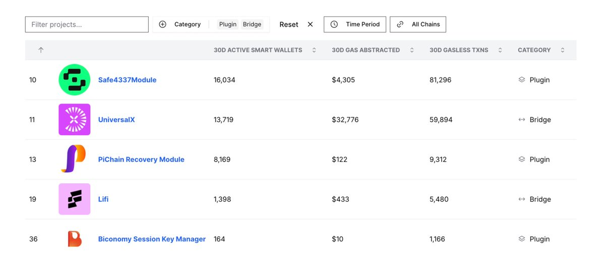 账户抽象和Gas赞助确实能提升交易量和用户注册,但真正的考验在于用户的重复参与。综合钱包数量、Gas抽象和无Gas交易量的数据可以看出,各类别的使用量往往集中在少数明星dApp或大规模的一次性活动中。像Piggybox这样的项目,通过几乎1:1的钱包与交易比例,可以迅速登上排行榜,但当过滤掉一次性账户后,其排名会迅速下降。而跨链桥与插件解决方案则展现出更稳定的中等使用量,反映了生态系统的实际需求,而非短期炒作。