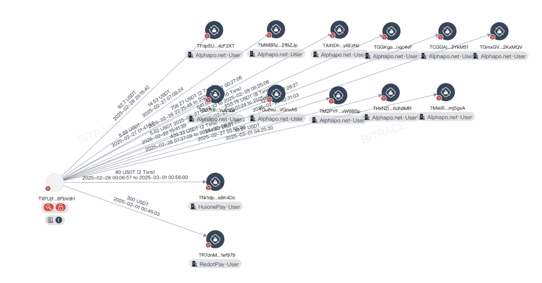 另一个波场地址 TXFUjf 在冻结前除了与交易所用户进行交互外,也与支付平台甚至网赌平台有较多关联。