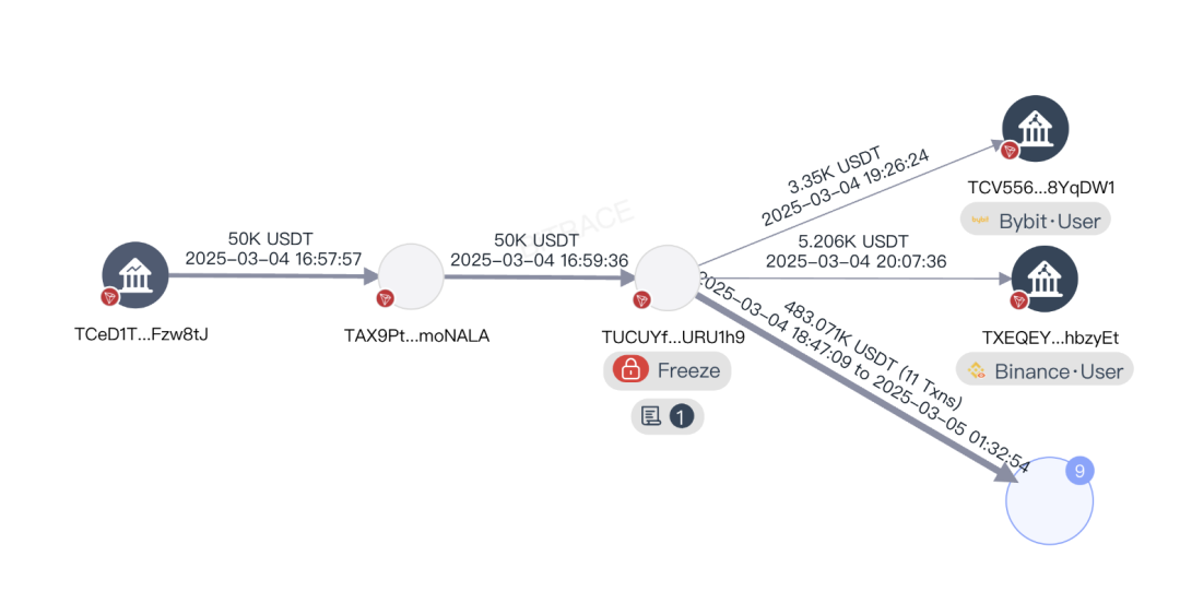 以本次事件中被冻结的波场地址 TUCUYf 为例,该地址的上游资金来源是某个支付或交易所平台的提款热钱包地址,在被冻结前该地址将部分资金转入其他中心化交易平台。