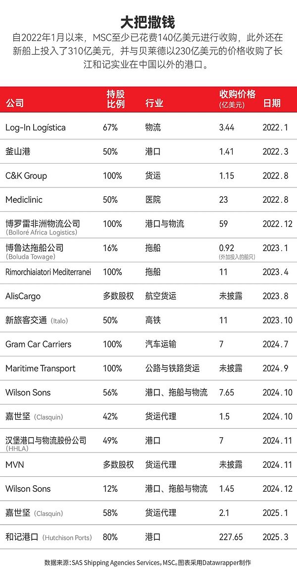 2022年3月,MSC收购了韩国釜山港50%的股份,八个月后,它又以59亿美元从法国亿万富豪文森特·博罗雷(Vincent Bolloré)的博罗雷集团那里收购了博罗雷非洲物流公司(Bolloré Africa Logistics),该公司拥有集装箱码头、陆港、铁路和物流服务等业务。此次收购使MSC成为非洲最大的物流公司和世界第七大港口所有者。去年11月,它以7亿美元的价格收购了德国上市物流公司汉堡港口与物流股份公司(HHLA)49.9%的股份,该公司在汉堡、爱沙尼亚、意大利和乌克兰敖德萨拥有主要港口。