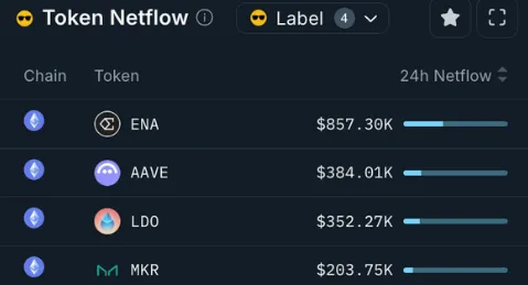 尽管目前主流稳定币发行商(如 Circle 和 Tether)尚未向普通投资者提供直接投资的渠道,但与稳定币相关的协议代币仍然是值得关注的选择,例如Ethena ($ENA) 和 MakerDAO/Sky ($MKR)。这些协议吸引了数十亿美元的总锁仓量 (TVL),并有望从稳定币市场的扩张中受益。然而需要注意的是,这两种代币也存在各自的问题。$ENA 目前仅有34%的代币进入流通,未来预计存在较高的通胀率。而 MKR 在过去几年中 TVL 增长基本停滞,未能从稳定币市场的快速增长中获益。 尽管如此,链上数据显示,具有市场洞察力的“聪明钱”正在增持 ENA 和 MKR,这表明这些代币可能在未来有比较出色的表现。