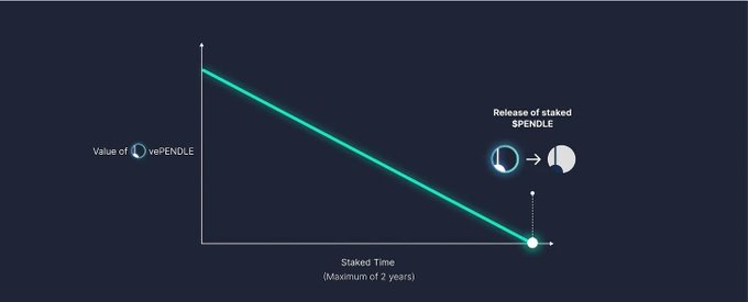 Pendle 通过 $PENDLE 代币的投票托管版本 $vePENDLE 改善治理和去中心化 。用户通过锁定他们的代币长达两年来获得$vePENDLE。锁越长越大,接收到的$vePENDLE 就越多。随着时间的推移,$vePENDLE 线性衰减到零,此时锁定的 $PENDLE 被解锁。