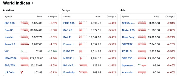 (截止4月7日收盘时,世界指数变化 来源:雅虎财经)