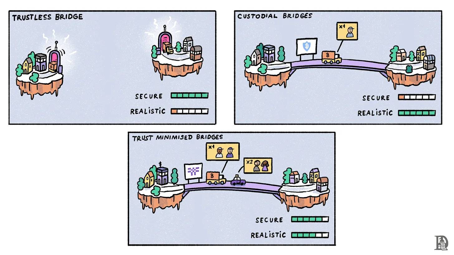 考虑到比特币操作码(opcodes)的能力,信任最小化桥接目前可以说是最好的桥接实现方式。信任最小化桥接的具体实现可能会因多重签名(multisig)的设计而有所不同。Threshold Network 的 tBTC、Stack 即将推出的 sBTC 实现以及 Botanix 的 spiderchain 都是信任最小化桥接的例子。