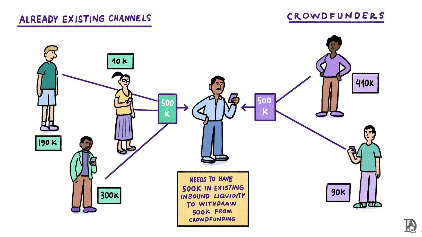 为什么这很重要?让我们用一个例子来理解。Joel 正在筹集 100 万美元以支付印度的咖啡种植工人,他决定使用 LN 接受捐款。他不能只是启动一个 LN 钱包并接受捐款。他需要有 100 万美元的入站流动性。入站流动性是你的对手方在通道中锁定的 BTC 数量。Sid 是 Joel 的一个对手方,锁定了 1 万美元。Joel 需要更多像 Sid 这样的对手方,他们总共锁定了 100 万美元,才能接受价值 100 万美元的捐款。这对网络扩展来说是一个重大挑战,因为入站流动性将始终受到资本机会成本的限制。