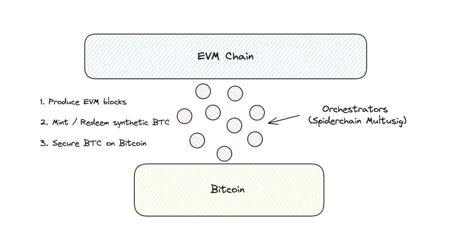 Botanix 团队带来了一个重要的创新:Spiderchain。什么是 Spiderchain?它是 Botanix 上的一种滚动多重签名机制的协调节点。让我们来详细解释一下。正如我们之前提到的,一个 L2 需要一个桥接和一个执行交易的链。协调节点负责在比特币上保护用户资金,并在 EVM 层上铸造和销毁合成 BTC。协调者运行比特币和 Spiderchain EVM(Botanix)节点。