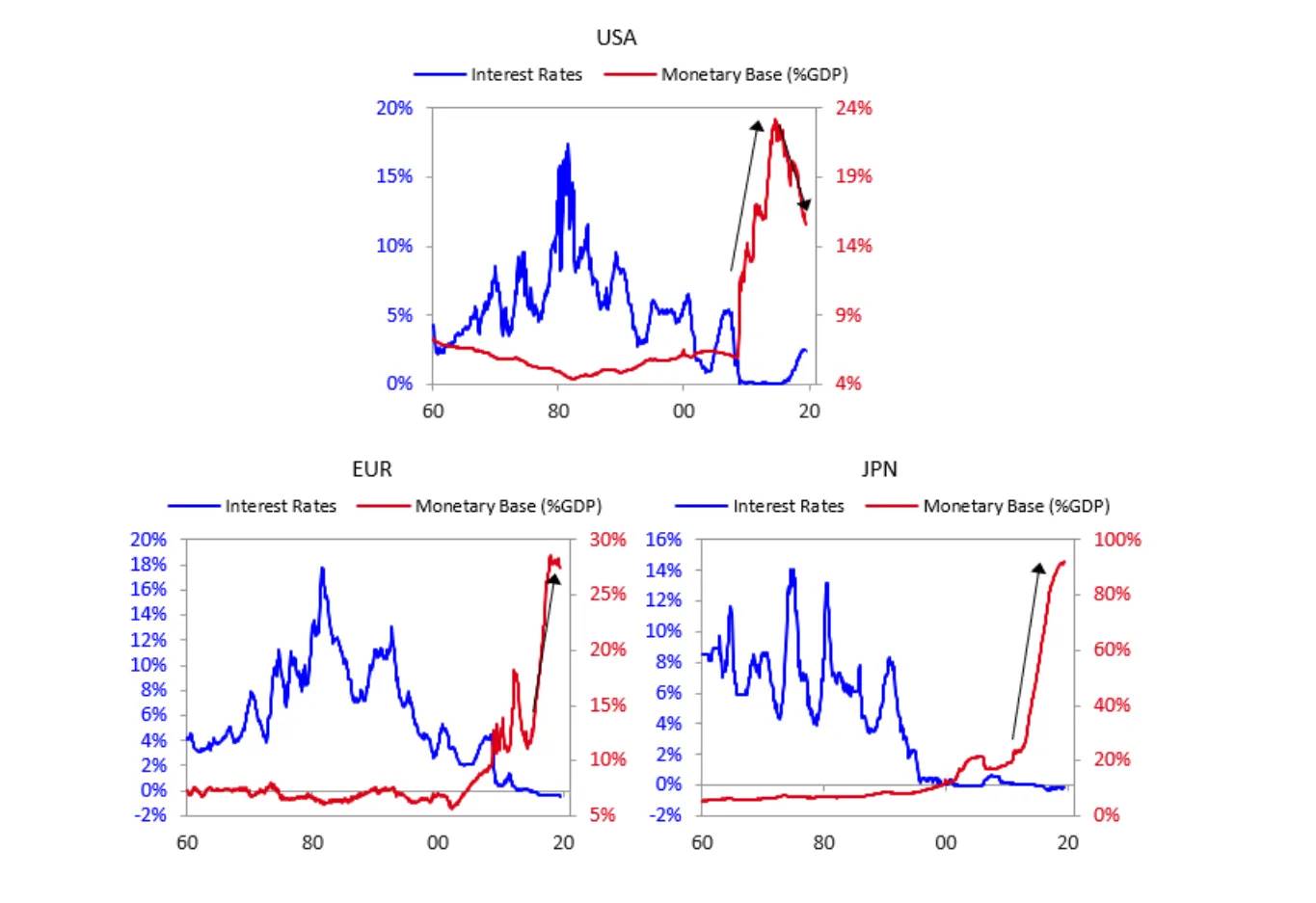 图表显示了自 1980 年代以来发达国家的利率如何下降。同时,货币基础作为 GDP 的百分比增长。因此,总产出并没有以与货币供应相同的速度增长。当货币供应迅速增加时,无论家庭收入增长率如何,都可能导致更高的通货膨胀、更高的生活成本、增加的债务负担和更大的收入不平等。我们目前所处的高通胀环境是中央银行采取的政策的结果。