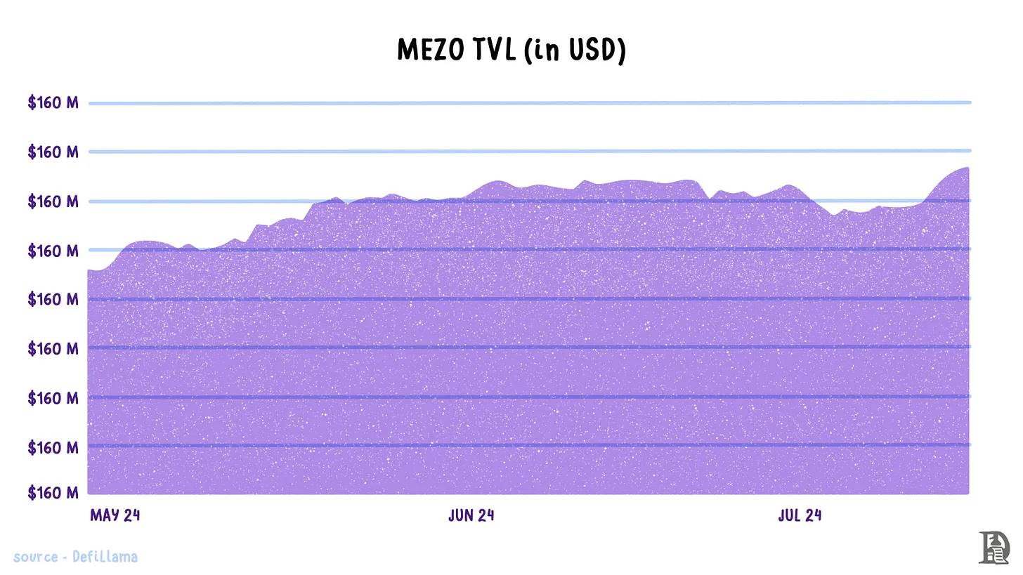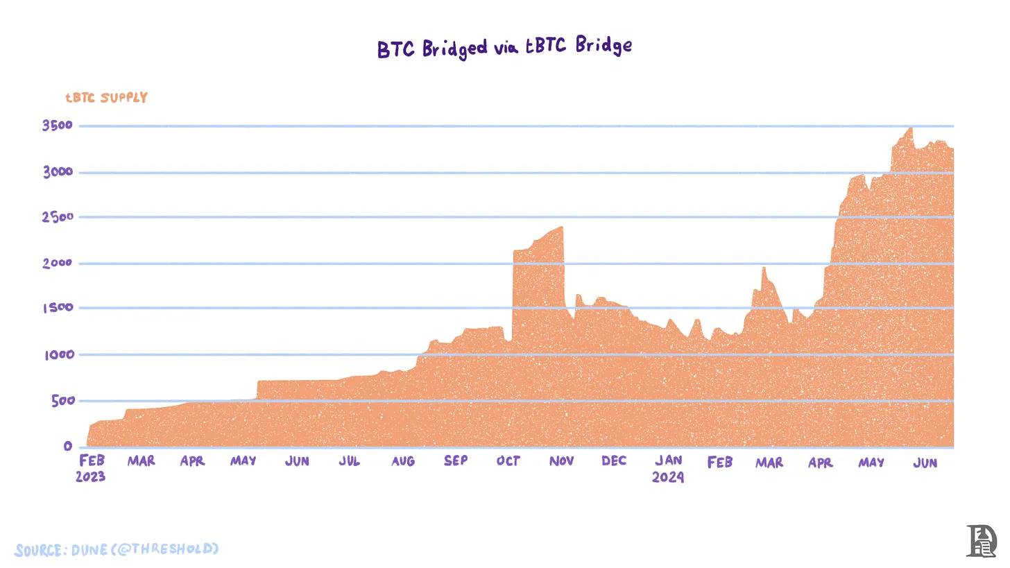 假设网络上有 N 个协调节点。每个比特币区块会随机选择 M( Botanix 的链是 EVM 兼容的,并由 PoS 共识机制保护。除了通过参与滚动多重签名网络来保护比特币上的 BTC 和促进合成 BTC 的铸造和赎回外,协调者还参与 EVM 链的区块构建。他们将 Botanix EVM 交易的根哈希(一个紧凑版本)作为铭文发布在比特币上。 需要注意的是,仅仅在比特币上发布数据并不意味着结算。这里的区别在于,像 Botanix 这样的外部链以铭文形式发布的数据存储在比特币节点(矿工)未验证的地方。比特币协议完全不知道这些数据。因此,无法确定铭文中发布的交易数据是否正确。 截至 2024 年 6 月,Botanix EVM 和 Spiderchain 仍处于测试网阶段。 Citrea 正在比特币之上构建一个 Zk 汇总。『比特币之上』的意思是,它打算使用比特币作为数据可用性层。Citrea 表示,扩展比特币区块的最安全和激励对齐的方式是通过链上可验证性和数据来分片执行。分片执行意味着将执行任务分成更小的部分。 然后,Citrea 将这些分片或交易批次聚合起来,并将两个交易批次之间的状态差异与称为有效性证明的证明一起发布在比特币上。但目前的问题是,比特币没有能力验证这些证明。Citrea 的最终形式将不得不等到比特币有了允许其验证 zk 证明的操作码。 在此期间,它将使用 BitVM 实现作为临时解决方案来处理证明,并桥接 BTC 进出汇总。自然,Citrea 也继承了前一节提到的 BitVM 的缺点。未来,随着 BitVM 的改进,Citrea 将改进其桥接功能。 截至 2024 年 6 月,Citrea 处于测试网阶段。 Mezo 自称是比特币的经济层,而不是比特币的 L2。它使用 Threshold Network 的 tBTC 桥接,将 BTC 引入和带出 EVM 链 Mezo。 Mezo 由开发了 tBTC, Fold, Keep 和 Taho. 等产品的团队构建。这个团队多年来一直致力于比特币相关应用的开发。Mezo 的目标很简单:扩展 BTC 的使用场景。它通过以下三种机制实现这一目标: 1.让 Mezo 用户通过质押 BTC 来保护网络并赚取收益。 2.允许用户用 BTC 支付 gas 费用,这些费用将分配给 veBTC 和 veMEZO 质押者。 3.构建一个端到端的 BitcoinFi 体验。 那么,什么是 BitcoinFi 和经济层?大多数新链,包括 EVM 链,都依赖现有的用户体验,例如相同的钱包和桥接工具。改进用户体验几乎从未成为优先事项。而 Mezo 从零开始设计整个用户体验,这是非常罕见的。它包括以下内容: · 一个由 BTC 支持的本地稳定币(mUSD),用户无需从其他链桥接。 · 一个由 BTC 担保的长尾借贷协议。 · 通过 Fold 提供的全面集成的上下车通道。 · 通过 Taho 提供的集成钱包体验。 将所有这些应用程序结合起来,Mezo 创建了一个独特的端到端 BitcoinFi 体验。 Mezo 基于 Cosmos SDK,并使用 Comet BFT 作为共识机制。 · CometBFT 是一种软件,用于在多台机器上安全且一致地复制应用程序。所谓的安全,是指只要少于三分之一的机器以任意方式出现故障,CometBFT 就能正常工作。所谓的一致,是指每台非故障机器都能看到相同的交易日志并计算相同的状态。安全且一致的复制是分布式系统中的一个基本问题;它在从货币到选举再到基础设施编排等广泛应用的容错中起着关键作用。——来源:CometBTF 文档 CometBFT 由两个组件组成:一个共识引擎和一个通用应用程序接口。基于 Tendermint 核心,共识引擎负责区块生产、验证和最终性。Tendermint 是最早的权益证明共识设计之一,提供拜占庭容错(BFT)共识,可以容忍多达三分之一的恶意节点。 应用程序接口(Application BlockChain Interface,ABCI)将共识引擎与应用程序分离。ABCI 的一个主要优势是,由于共识和应用程序是分开的,开发人员不必用与共识引擎相同的语言构建应用程序。该接口作为一个媒介,将交易传递给应用程序执行。这种能力使系统更加模块化,有助于吸引更多的应用程序开发人员。最初,Mezo 只兼容 EVM 运行时。 Mezo 的经济设计使得随着它的普及,BTC 持有者可能会直接或间接受益。他们可以在 Mezo 上质押 BTC 以赚取质押收益,或者如果他们选择继续持有 BTC 在比特币网络上,他们将从 BTC 被取出流通(用于支付 Mezo 上的费用)中获得一些好处。 Mezo 有一个双重质押模型,如下图所示。网络上的验证者可以质押 BTC 和 MEZO(Mezo 网络的本地代币)。通过质押 BTC 和 MEZO,验证者分别获得 veBTC 和 veMezo。「ve」代表验证者托管,这些代币通常锁定在智能合约中。验证者托管代币持有者具有治理权,网络奖励和费用收入与他们共享。 资产锁定时间越长,发放的 ve 代币越多。veBTC 质押者赚取 BTC,veMEZO 质押者赚取 MEZO 奖励。部分 MEZO 奖励可以被销毁以增加 BTC 库存。 收益是 Mezo 的核心功能之一,因为用户支付的费用会分配给质押 BTC 的验证者。Mezo 计划通过其姊妹项目 Acre 提供的流动性质押进一步扩展 BTC 质押的应用范围。当用户将 BTC 存入 Acre 时,他们会获得一个流动性质押代币 stBTC 作为回报。存入的 BTC 会被用于跨链和 DeFi 应用。通过这些活动产生的收益会累积在 stBTC 中,而 stBTC 可以 1:1 兑换为 BTC。 尽管 BTC 的市值超过一万亿美元,但在借贷市场上几乎没有发挥作用。下图显示了 WBTC 在借贷市场中的分布情况。数据显示,从 2023 年 7 月到 2024 年 6 月,前三个借贷应用中使用的 WBTC 数量从约 50,000 减少到约 23,000。借贷应用中 WBTC 总量的下降可以归因于 WBTC 供应量下降了 48%,从 2022 年 5 月的 285,000 WBTC 降至现在的略高于 150,000 WBTC。这种下降主要是由于市场在 
