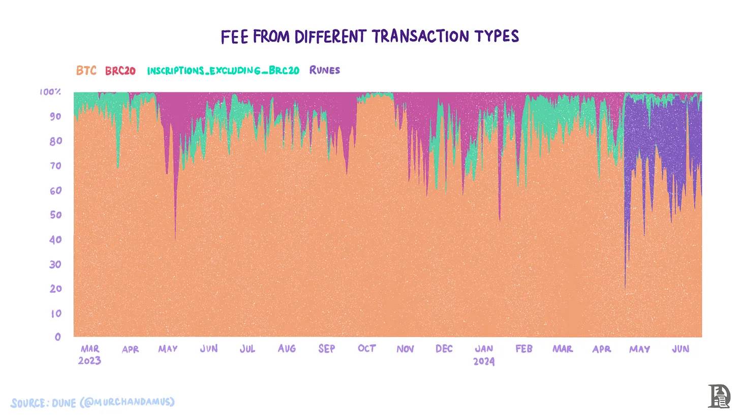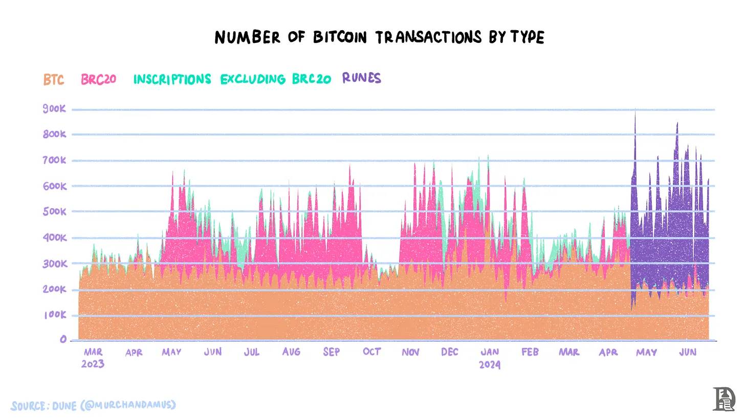 Ordinals 协议是一种利用比特币 UTXO 并以不同方式查看单个 Satoshi(BTC 的最小单位)的方法,它带来了铭文(比特币上的 NFT)等创新。围绕 Ordinals 和铭文的热情带来了可替代标准如 BRC-20 和符文的演变。铭文和符文给比特币带来了活动的提升。每日交易总数相比仅 BTC 转账增加了 70%。