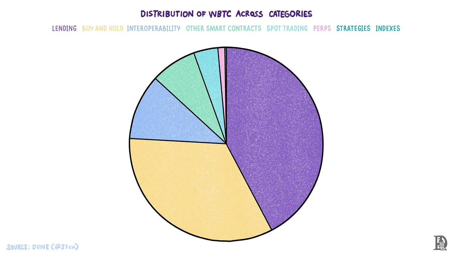 Wrapped BTC (或 WBTC) 是不同 DeFi 生态系统中最广泛使用的 BTC 版本,其市值约为 100 亿美元,占总流通 BTC 的不到 1%。这显示了 BTC 金融化的巨大潜力。