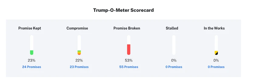 特朗普在曾经的竞选中实际上说出过很多承诺,一般统计中会挑选较为严肃、公开场合发表、且被数次提到的承诺。根据中立网站 PolitiFact 的统计,特朗普在其上一任总统期间,成功遵守了约 23% 的承诺,让步并部分实现了 22% 的承诺,但是打破了约 53% 的承诺。也就是说,在遵守竞选诺言这一点,数据似乎更支持 Arthur Hayes 的观点。