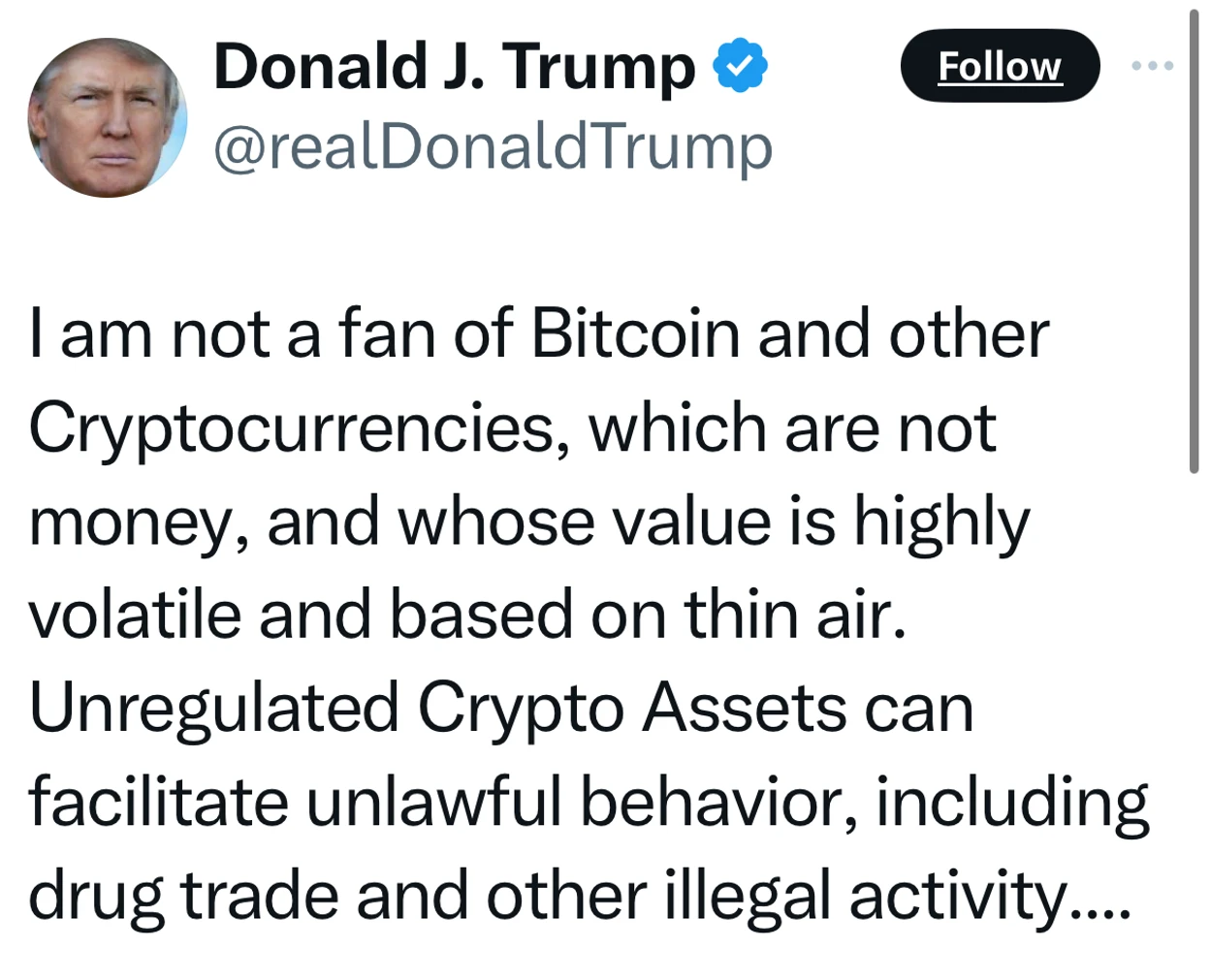 但是,同时也有持反对意见的人士出现: 7 月 11 日,Arthur Hayes 称特朗普「突然关心起来加密货币」的行为并不真诚。