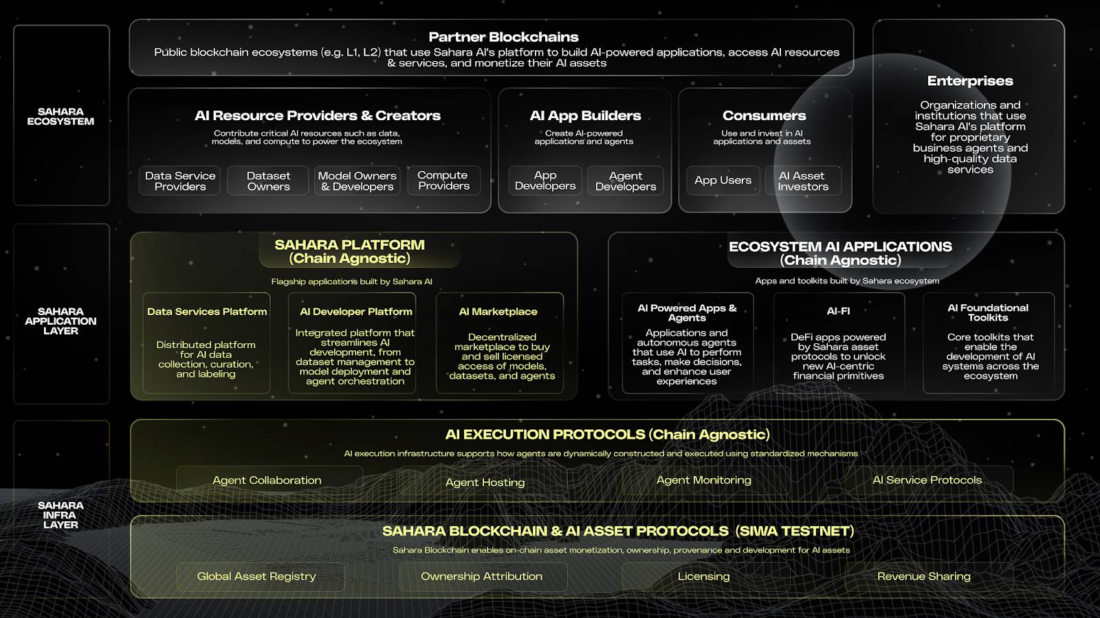 不同于围绕已有 AI 工具进行 Web3 包装,Sahara AI 自诞生起便试图建立一种全新的智能资产秩序 —— 在这里,数据、模型、智能体等关键资产可以被注册、授权、验证与分润,构成 AI 时代的“链上产权层”与“价值分配层”。
