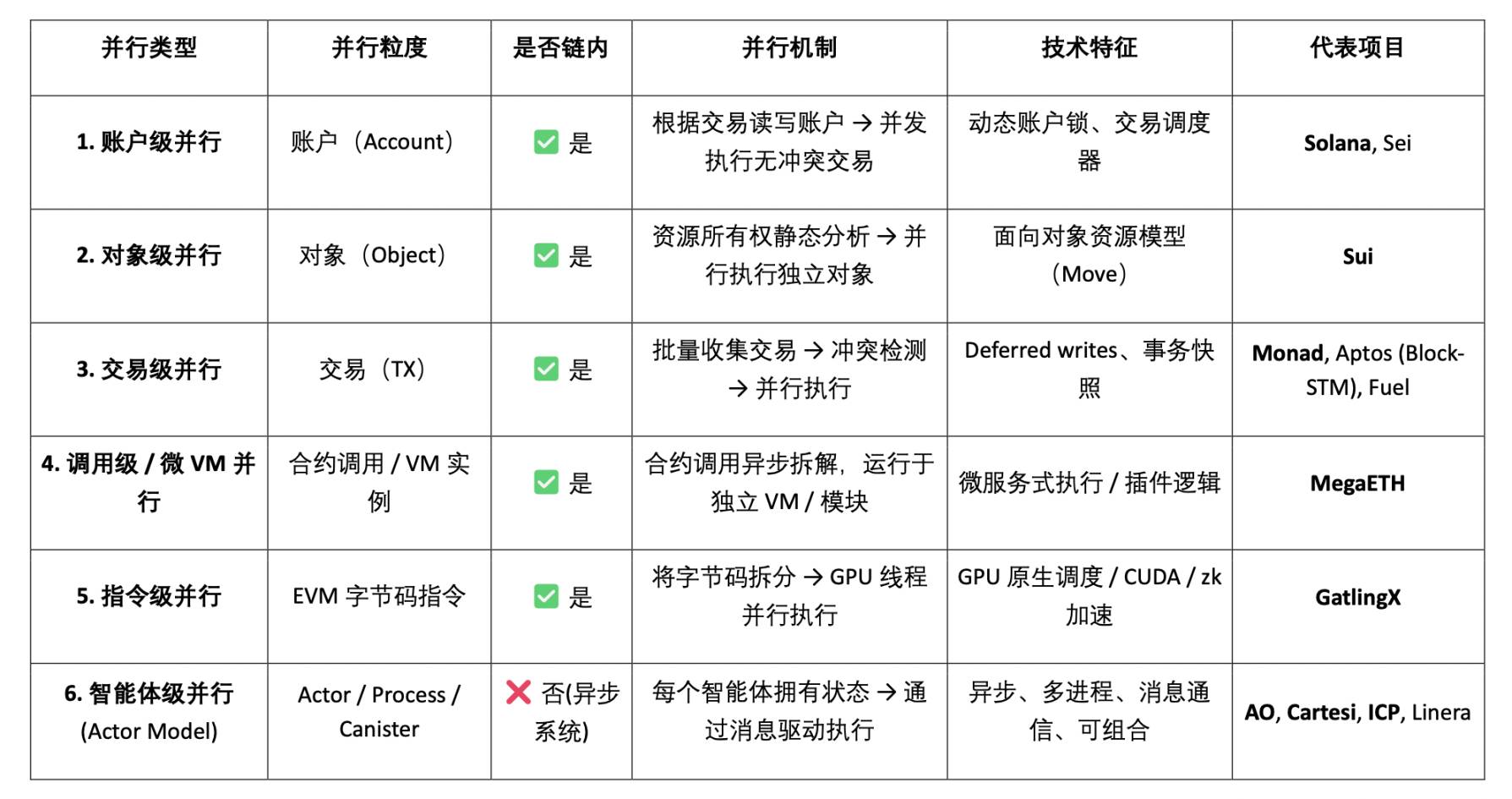 链内并行计算 (intra-chain parallelism),关注区块内部交易 / 指令的并行执行。按并行机制划分,其扩容方式可以分为五大类,每类代表了不同的性能追求、开发模型和架构哲学,依次并行颗粒度越来越细,并行强度越来越高,调度复杂度也越来越高,编程复杂性和实现难度也越来越高。