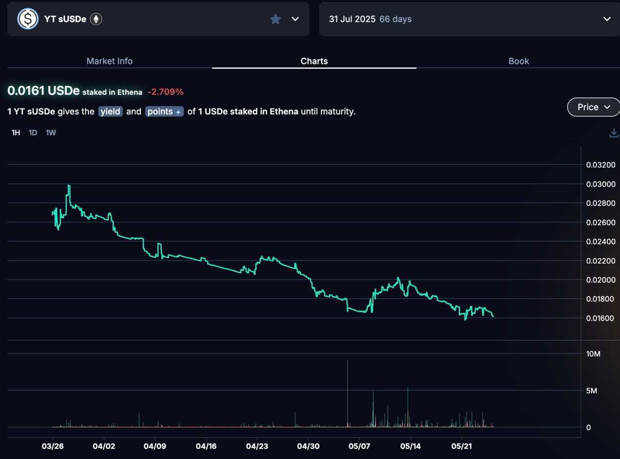而YT的资金杠杆能力的产生,正是源自于此。由于只有收益权,因此YT的价格是远低于1个生息资产,因此购买YT,意味着你可以利用少量的资金撬动更大的生息资产规模为你捕获收益。以上图YT sUSDe Jul 25为例,YT的市价为0.0161USDe,这就意味着在不考虑交易滑点时,假设你的资本为1USDe,你可以购买62个YT,这就意味着在未来的66天内,你获得62个USDe的收益权,这正是资金杠杆的本质。