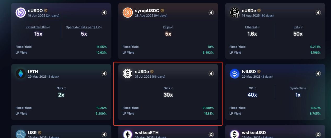 若想了解如何正确计算潜在的point收益率,明确各项目的point分发机制是十分重要的。还是以Ethena为例,截止到目前,Ethena一共进行了3轮积分活动,并且已经在2025年3月25日开启了第四季积分激励,并持续6个月时间,总计分配的ENA奖励不低于3.5%。在Ethena中,为很多USDe的使用场景设计了不同的sats point激励速度,具体机制将按照参与场景的法币本位金额,以不同的“倍数”,按天分配积分。