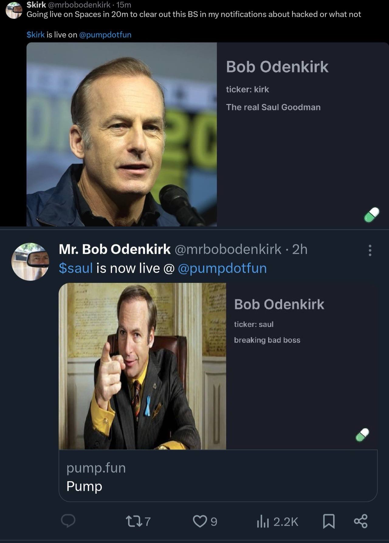 7 月 9 日,Bob Odenkirk(《绝命毒师》和《风骚律师》演员)的社交账号被黑客攻击,并发布了一个 meme 币的链接,就像悉尼·斯威尼的情况一样。不过,这次他们搞砸了,发布了两个币(KIRK 和 SAUL),因此获利金额很小。