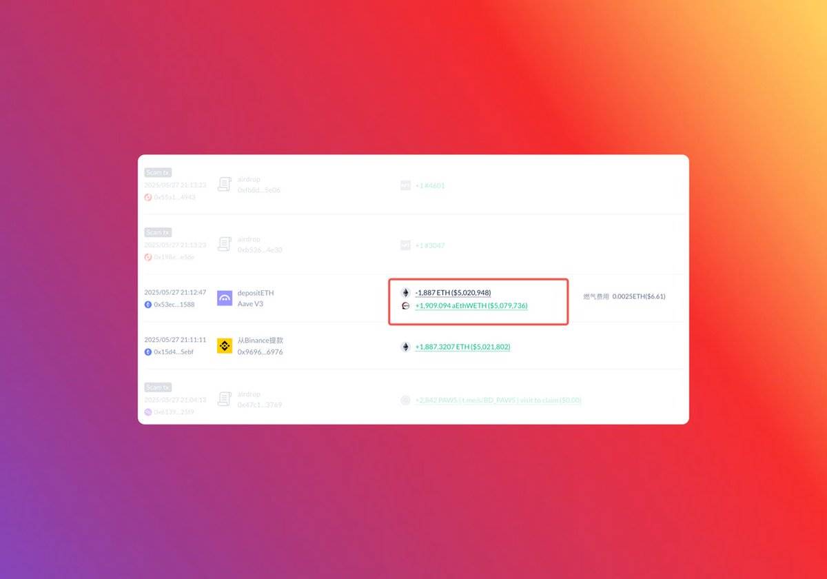 5月27晚上9点12:花费 507w 美元,购买 1887 ETH,存入 Aave(确定性机会买入 ETH)