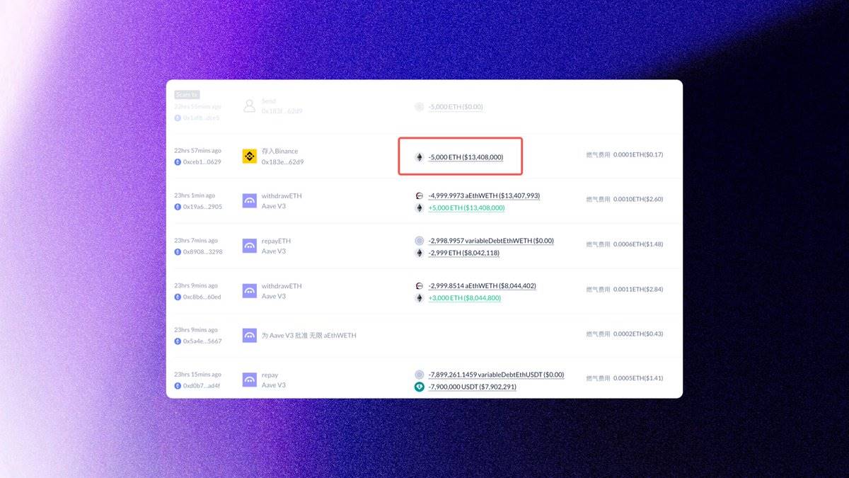 23小时前:从 Aave 借出 3000 个 ETH 存入 Binance 卖掉(800w 美元,卖出后去 Aave 还款)
