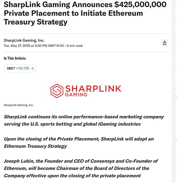 2025 年 5 月,一场资本的盛宴在 SharpLink 身上上演。以太坊联合创始人 Joe Lubin 领导的 ConsenSys 联合多家加密领域风投公司,如 ParaFi Capital、Pantera Capital 等,强势出手,通过一笔高达 4.25 亿美元的私募股权投资(PIPE),主导了对 SharpLink 的收购。他们以每股 6.15 美元的价格发行了 6910 万股新股,迅速掌控了 SharpLink 超过 90% 的控制权 。这一过程堪称迅速而高效,省去了传统 IPO 或 SPAC 所需要经历的繁琐流程,Joe Lubin 更是被任命为董事会主席。随后,ConsenSys 明确表示将与 SharpLink 紧密合作,共同探索 “以太坊金库策略”,一场围绕以太坊的资本运作大戏正式拉开帷幕。