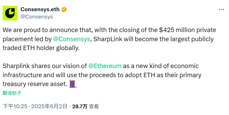 除此之外,Consensys 担任了 SharpLink Gaming 4.25 亿美元融资的主导投资方, Joseph Lubin 将在本轮融资完成后出任 SharpLink 董事会主席。