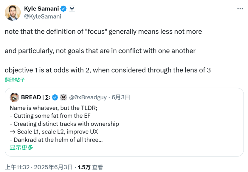 不过也有人表示仍未解决关键问题,Multicoin Capital 联创 Kyle Samani 就发推评论表示,「请注意,专注这个词的定义通常意味着更少,而不是更多,尤其是目标之间不应相互冲突。但当我们从目标 3(即 L1、L2 网络扩展,提高用户体验)的角度来看时,目标 1(即裁员)与目标 2(即明确职责分工)是相互矛盾的。」