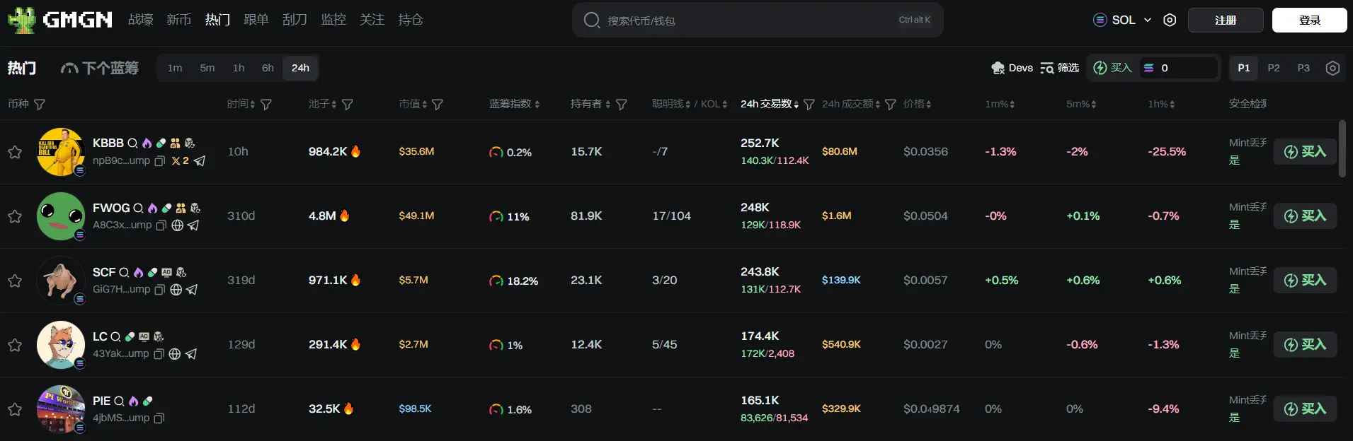 过去 24h Solana 热门代币前五依次为:KBBB、FWOG、SCF、LC、PIE