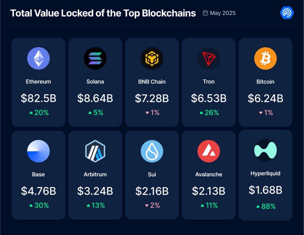 DeFi 在 5 月份延续了上升趋势,TVL 增长了 25%,使该行业的总规模达到约 2000 亿美元。此次复苏与整体市场上涨密切相关,尤其是比特币创下历史新高,以太坊价格飙升 40%,这两者都显著提升了 DeFi 资产的估值和流动性深度。