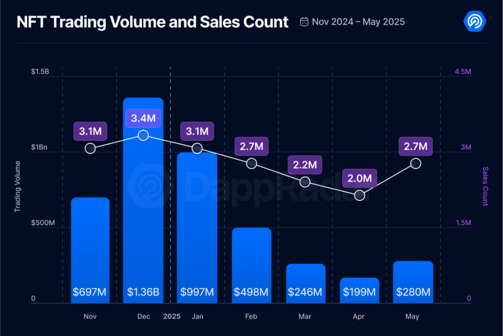 5 月,NFT 市场出现复苏迹象,交易额攀升至 2.8 亿美元,环比增长 40%。同样,NFT 交易笔数也增长了 35%,达到 270 万笔。尽管这一增长带来了一丝乐观,但还远不能称之为全面复苏。要形成可持续的趋势,需要连续数月保持增长,但小小的胜利也是胜利。