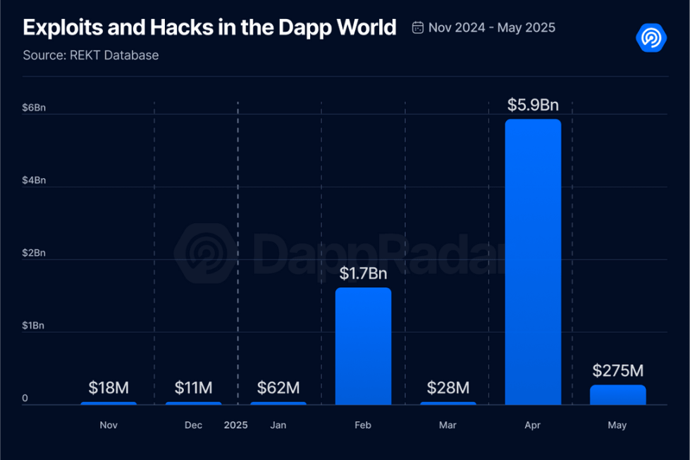 尽管这一数字较 4 月创纪录的损失大幅下降了 95%,这在很大程度上是由于 Mantra DAO 事件所致,但将此视为复苏的迹象则具有误导性。5 月单次攻击的严重程度凸显了 dapp 生态系统中持续存在的系统性漏洞。