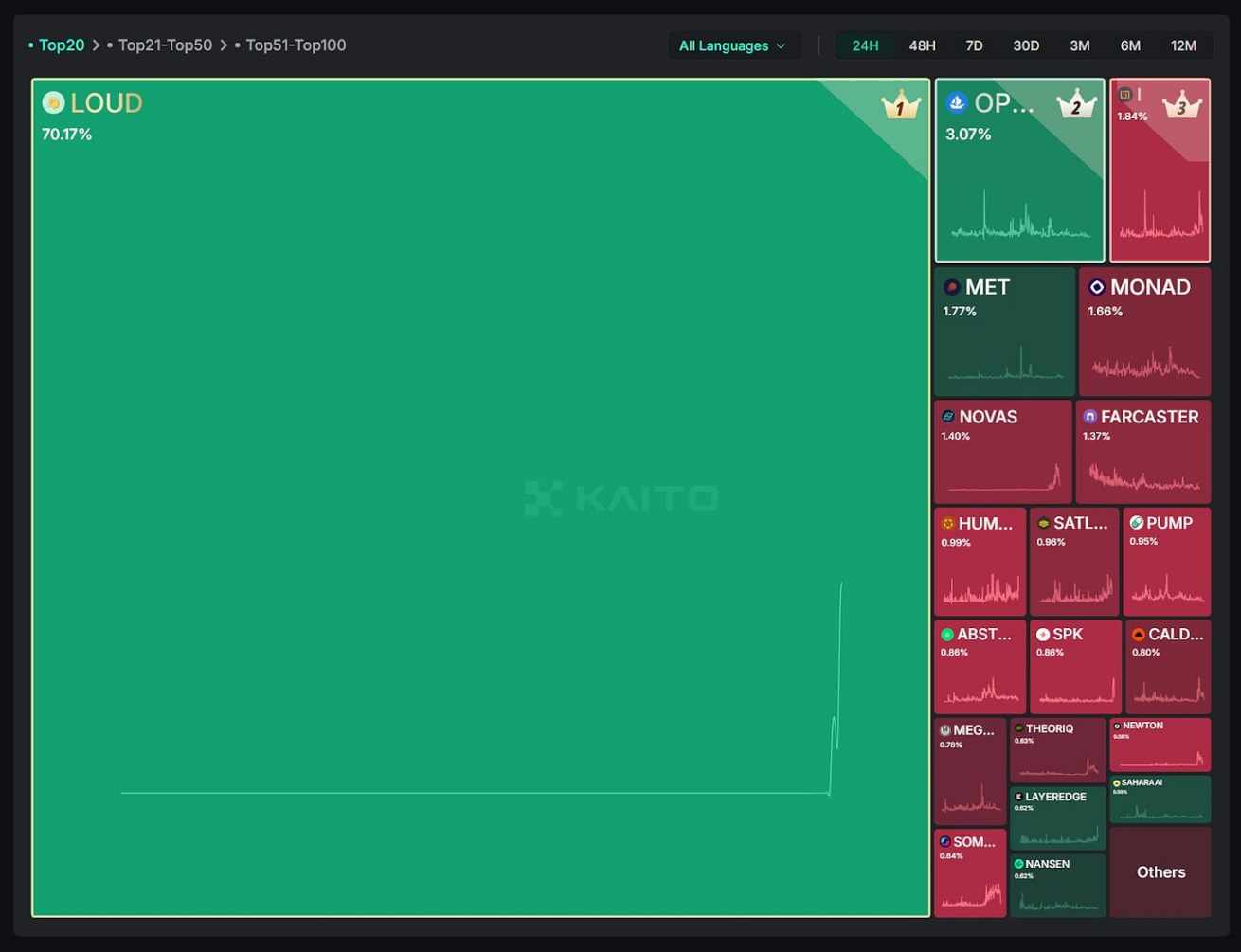 第二个问题是奖励中心化。基于注意力的奖励开始聚焦于特定项目或主题,其他项目的内容实际上被动从市场中消失或减少了,Kaito 的共享数据清楚地表明了这一点。Loud 曾一度占据 Twitter 上超过 70% 的加密内容,主导了生态系统内的信息流。当奖励聚焦于注意力时,内容多样性就会下降,信息也会逐渐围绕提供高额代币奖励的项目而产生。最终营销预算的规模决定了生态系统内的影响力。