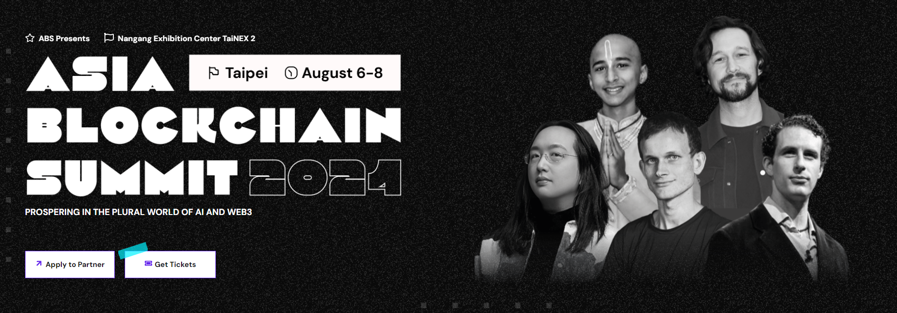 Asia Blockchain Summit 2024 将于 8 月 6 日至 8 日在台北举行在台北南港展览馆重磅回归!今年的 ABS2024 将汇集区块链、AI 人工智慧领域的领导者和开发者,探讨最前瞻技术和去中心化治理未来。大会邀请到以太坊创始人 Vitalik Buterin、TON 基金会主席 Steve Yun、Gitcoin 共同创办人 Tomicah Tillemann 博士、Project Liberty 执行长 David Yu 等出席发表观点。点击查看官网