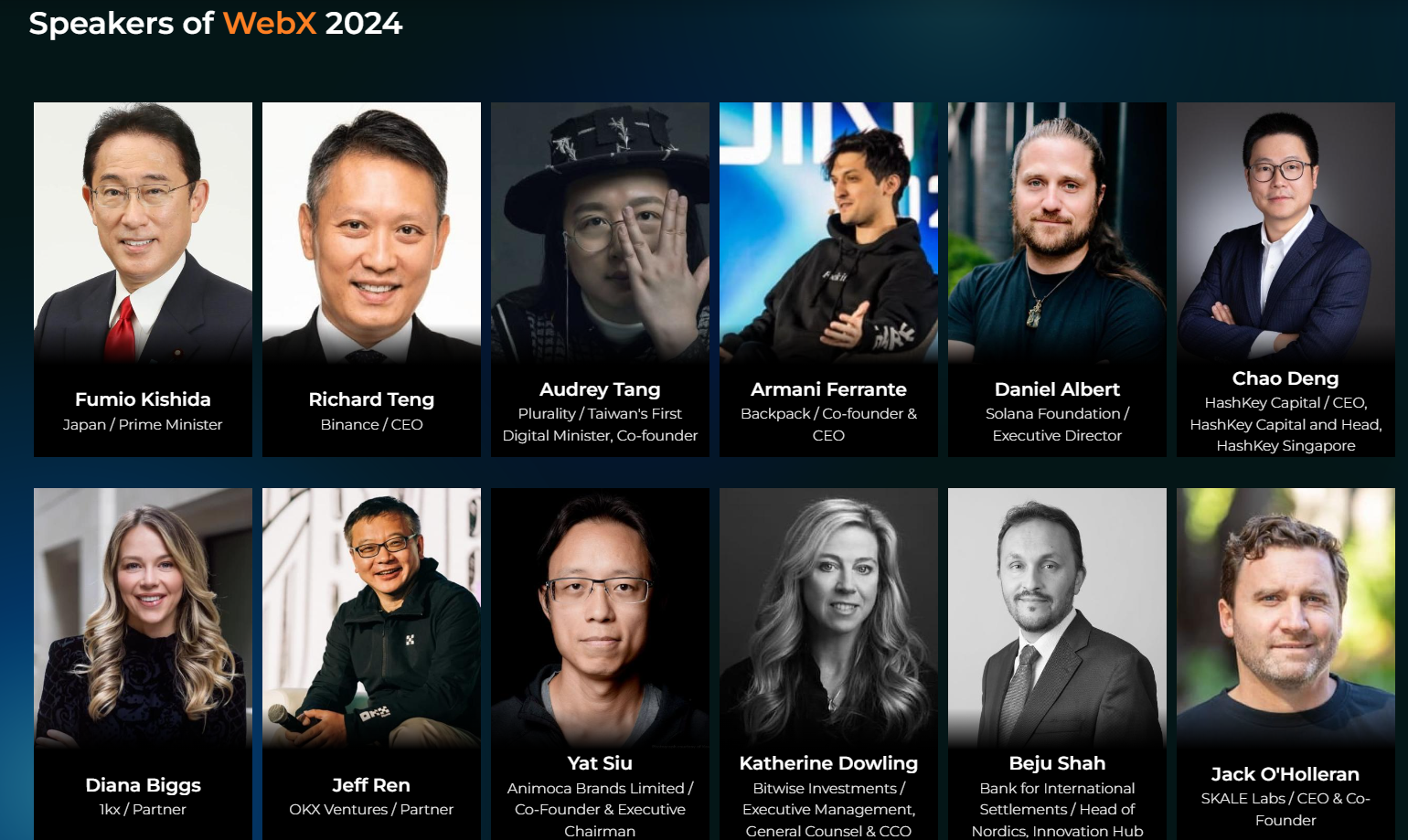 WebX 2024 大会由日本 Web3 媒体 CoinPost 主办,大会于 2024 年 8 月 28 日至 29 日在日本东京开幕。预计将有超过 20000 人出席本次盛会。除了主会议外,大会还包含小组论坛,Web3 全球公司博览会,数十场派对以及 100 余场周边活动。本次大会的嘉宾也非常值得关注。大会将邀请到 日本首相 Fumio Kishida,Binance CEO Richard Teng,Solana 基金会执行董事 Daniel Albert,HashKey Capital CEO Chao Deng 等。点击查看官网