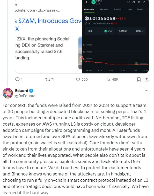 Eduard宣布ZKX关停的消息在加密社区引起一片哗然,纷纷表示不解,因为就在几周前,ZKX才刚刚完成了代币TGE,并公布完成了760万美元新一轮融资。