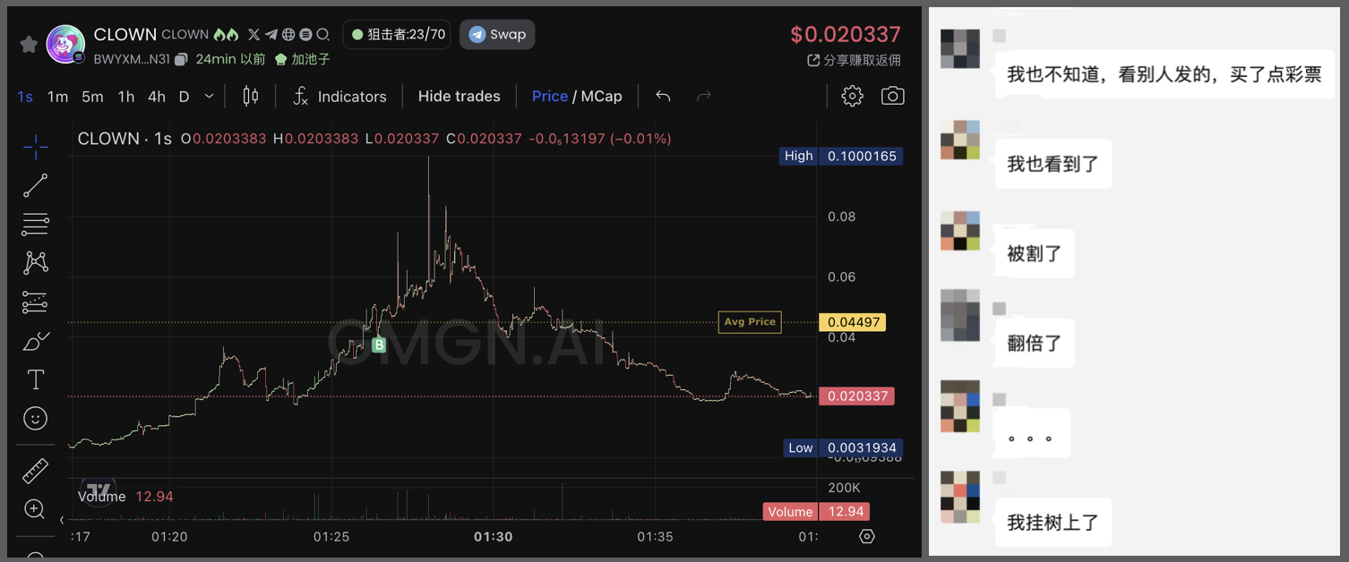 左:meme 币 CLOWN 的秒线,右:社群关于一个 meme 币讨论